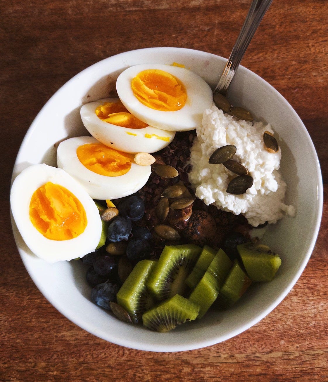 I’ve been experimenting with savory oats using the Qi’a grains blend, and one bowl this week felt like a small masterpiece. A 7 minute, 45 second egg (timing matters), a generous spoon of cottage cheese, walnut butter, heirloom pumpkin seeds, kiwi, blueberries, cacao nibs, cinnamon, and a touch of coarse salt. Random, but trust.